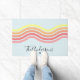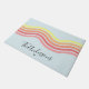Grüße Freunde und Familie zu Ihrem Haus mit diesem lebendigen und auffälligen personalisierten Retro farbenfrohen Blue Groovy Lines Beach Sunrise Doormat, mit abstrakten wellenförmigen Linien in einer Farbpalette inspiriert von einem schönen Sonnenaufgang. Ideal für ein Strandhaus, Ferienhaus, Hütte am Meer oder ein wunderschönes Hauswärmeschenk.