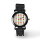 Fühlen Sie sich mit dieser Retro-farbenfrohen Nester Kid's Watch in Ihrem Nest! Das Design zeichnet sich durch einen cremefarbenen Hintergrund mit goldenen Falten und Reihen wunderbar kitschiger, farbenfroher Halbkreise aus, die sich auf minimalistischen, schwarzen Ästen ruhen. Die Halbkreise ähneln Märchen, Vogelnesten in hellblauen, aquamarinen, türkisfarbenen, orangen, rosa, gelben, grünen, grauen und braunen Tönen. Die orangefarbenen Nester haben ein lustiges Ziegelmuster und die braunen Nester sind mit einem Cartoon-Holzkorn versehen. Die nestgefüllten Bäume wechseln sich von rechts nach oben und von oben nach unten ab, was bedeutet, dass dieses skurrile Design sogar perfekt aussieht, wenn man auf dem Kopf stehend ist. Dieses Muster erinnert an ein Vintages modernes Design aus der Mitte des Jahrhunderts. Sie werden sicher unsere Hommage an die 50er Jahre genießen. Kaufen Sie das heute und seien Sie die coolstste Katze auf Ihrem Block.