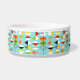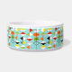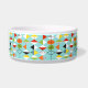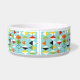 Diese Retro Harlekin-Muster-Keramik-Hundeschüssel ist- moderne Art der Mitte des Jahrhunderts an seinem feinsten. Die Vintagen inspirierten Ausrüstungsbeschreibungen, die ein Aquahintergrund mit Reihen der dreieckigen Formen, die einen Harlekin bilden, kopieren. Die zwei-getonten Diamantformen sind gelb, weiß, rot, orange, schwarz, grün und Weiß mit schwarzen Akzenten. Aber Wartezeit, dort ist mehr! Es gibt auch orange Ovale, grüne Ovale mit schwarzen Sternexplosionen und Konturen der schwarzen Diamanten. Setzen Sie Zeit März an fest, aber Sie glauben, wie Sie eine kitschy Explosion von der Vergangenheit mit diesem bunten geometrischen Schatz gefunden haben.