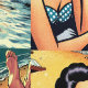 Hübsche Pinup-Mädchen am Strand mit einem Retro Mitte des Jahrhunderts. Farbenfrohe Strandszenen mit einer schönen Frau und Cocktails.