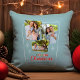 Fügen Sie Ihrer Zuhause eine Touch Retro-Charme mit diesem 3 Foto Weihnachtskissen hinzu! Das moderne Design der Mitte des Jahrhunderts bietet Platz für drei Ihrer beliebten Fotos. Der Hintergrund wird aquamarin durch weiße Sternexplosionen, Schneeflocken und mehrfarbige Vintag inspirierte Typografie gedämpft.