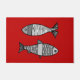 Doormat in einem modernen, whimsical, Retro-Fischmuster der Mitte des Jahrhunderts, in den Tönen von leicht silber grau / grau bis tiefgrau grau auf einem tiefen lipstick roten Hintergrund