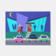 Diese Retro offenes Haus-Party-Tür-Matte setzt Sie in die partying Stimmung ein. Die CartoonAusrüstungsbeschreibungen das Äußere eines modernen Hauses der Mitte des Jahrhunderts. Durch den Boden zu den Deckentürkis-Glaswänden, können wir die Marineblau-Silhouetten festlicher Party Goers sehen. Es gibt Paare, die vor einem Fenster plaudern. Auf der gegenüberliegenden Seite des Raumes können wir sehen, dass ein Tanzenmann und der langatmige Mann jeder versucht zu vermeiden. Das Äußere des Hauses kennzeichnet eine heitre rote Tür und einen lila Ziegelsteinüberformatkamin. Ein grauer Gehweg schneidet eine Schwade zur vorderen Tür, durch das aquamarine Gras. Die Nachtzeitszene hat einen dunkelblauen Himmel mit einem Gelb, sichelförmigen Mond. Ein attraktives Paar tut den Cha-cha-cha auf der Weise zu ihrem Auto. Die blonde Frau trägt ein helles rotes Kleid. Ihre hübsche Eskorte trägt einen schwarzen Anzug und eine rote Krawatte. Seine Hände werden um die Taille der Frau eingewickelt. Auf der Straße vor dem Haus, können wir drei, hell farbige klassische Autos sehen. Auftrag heute und Party wie es ist 1959!