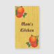 Eine benutzerdefinierte magnetische Visitenkarte mit Platz für Ihren Namen in Skriptbraun Buchstaben, mit Retro-Kunst von Orangen vor einem Imitat Holz plank Hintergrund.