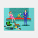 Dieses Retro Paar mit Hundetür-Matte sieht wie eine Szene aus einer romantischen Komödie heraus aus. Die Art der Sechzigerjahre, unbedeutende KunstAusrüstungsbeschreibungen ein attraktives Paar, das zu Hause einen romantischen Abend genießt. Der hoch entwickelte Raum kennzeichnet vorstehend ein Aqua und aquamarinen einen Ziegelsteinkamin mit einer hellen roten Leiste. Ein schönes, die Redheadfrau, die ein helles, Rosakleid trägt, wird auf der Leiste gehockt. Sie genießt einen Martini mit einer sich hin- und herbewegenden Olive, einem Brüllenfeuer, guter Musik und der Firma ein hohes, eine Dunkelheit und ein gutaussehender Mann. Der Mann trägt einen blauen Anzug und eine rote Krawatte. Sein Martini-Glas wird angehoben, um seinen reizend Begleiter zu rösten. In seiner anderen Hand hält er ein VinylRekordalbum. An seinen Füßen sehen wir eine entzückendste Dackel, einen roten Kragen zu tragen. Der playful Dackelhund geht in Richtung eines grünen Rekordspielers mit Orange, Spindelbeine. Auf dem Boden gibt es eine bunte Gruppe Spaß, eklektisch, VinylPlatten. Beifall! Ist hier zum perfekten Abend zu Hause.
