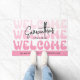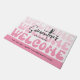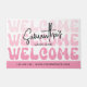 Moderne Begrüßungstürmatte mit Retro-Schriftart und rosa Gradientenhintergrund. Das groovy Schriftart Design lautet "welcome" mit trendigem Script-Schriftart, auf dem Sie Ihren Namen oder Firmennamen schreiben können; es gibt sogar Platz für Ihre Telefonnummer und Website. Diese trendige Bodenmatte fügt Ihrem Friseur, Schminkstudio, lash-Bar, Nägel-Wellness-Center oder jedem anderen Privat- oder Geschäftsbereich eine Touch von Spaß und Weiblichkeit hinzu.