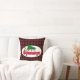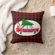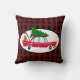 Ein Kissen mit einem coolen alten Wagen, der auf dem Dach einen grünen Kiefernbaum trägt, und ein Geschenk, das im offenen Kofferraum versteckt ist. Der Flair im Retro-Stil der 50er Jahre. Roter Büffel karierter Hintergrund.