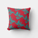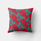 Farbenfrohe Kissen mit einem türkisfarbenen Retro-Bandana-Paisley-Schmetterlingsmuster auf einem roten Hintergrund.