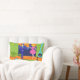 Dieses Retro Romantic Abend Couple Lumbar Kissen sieht aus wie eine Szene aus einer romantischen Comedy aus den 1960er Jahren. Das minimalistische Design bietet ein attraktives Cartoon-Paar im Wohnzimmer eines modernen, urbanen Apartments aus der Mitte des Jahrhunderts. Der Raum ist mit einer grünen Steinwand versehen, die von einer Decke bis zum Boden reicht und einen Ausblick bietet. Durch das Fenster können wir die blaue Silhouette einer großen City-Skyline sehen. Ein Halbmond ist nur im orangen Himmel des Sonnenuntergangs zu sehen. Die Einrichtung des Zimmers umfasst einen grünen Sitzstuhl mit passendem Fußhocker, eine gelbe, sputnikfarbene Leuchte sowie einen türkisfarbenen, konischen Kamin, der mit einem Brand versehen ist. In der Mitte des orangefarbenen Bodens befindet sich ein runder, grüner Teppich. Auf dem Teppich befindet sich ein tragbarer, türkisfarbener und schwarzer Plattenspieler. Neben dem Plattenspieler kann man eine Schallplatte aus einem kitschigen Albumcover sehen. Auch auf dem Teppich befindet sich eine schwarze, schlanke Katze, die einen aquamarinen Kragen trägt. Diese extravagante Katze sitzt vor einem Martini-Glas. In dieser Szene haben wir ein sehr raffiniertes Paar. Es gibt einen suave Mann mit einem blauen Anzug, hellblauem Shirt und roter Krawatte. Der große, dunkle und gut aussehende Mann genießt die Begleitung einer eleganten Blondine. Die hübsche Dame trägt ein heißes rosa Kleid mit einem formschönen Bodice und einem geschmackvollen Rock. Sie besitzen jeweils ein Kristallmartini-Glas mit schwimmendem Olivenöl. Auf der gegenüberliegenden Seite dieses Kissens befindet sich ein grünes, steinernes Muster. Prost! Hier zum perfekten Abend bei Zuhause!