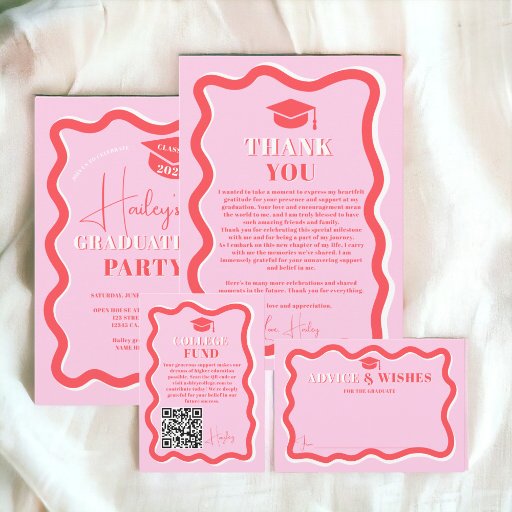Ein cooler Name Abschluss Open House Einladung mit Retro rosa rosa Kurve quiggle wavy Foto. Alle Texte, Namen und Hintergrundfarben sind anpassbar.