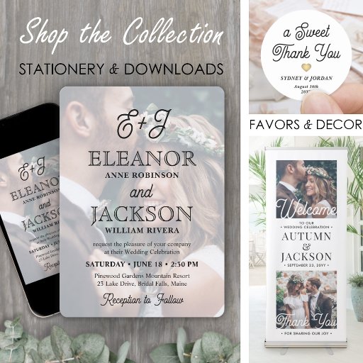 Freuen Sie sich auf eine elegante Hochzeitsfeier mit stilvollen mit Monogramm Foto-Einladungsmagneten. Das Bild und alle Formulierungen auf dieser Vorlage sind einfach zu personalisieren, und der magnetische Rücken macht sie für Freunde und Familie leicht zu zeigen. (IMAGE PLACEMENT TIP: Eine einfache Möglichkeit, ein Foto genau so zu positionieren, wie Sie es gewollt haben, besteht darin, es einzuschneiden, bevor Sie es auf die Zazzle-Website hochladen.) Die Gesamtästhetik dieses Designs ist schick und modern mit etwas Vintagem Flair. Es zeigt ein Bild des verlobten Ehepaares, überlagert mit trendiger Retroskriptkalligraphie und klassischer Serifentypografie. Sämtliche Zeremonie- und Empfang-Formulierungen können angepasst oder gelöscht werden. Diese einzigartige, schwarz-weiße Magnetkarte macht eine elegante Ergänzung zu einem besonderen Tag. Herzlichen Glückwunsch an die Braut und Bräutigam!