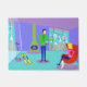Brrr... Diese Retro Ski Vacation Door Mat wird Sie auf der Suche nach einem Heiligen Bernard mit einem Kasten von Brandy. Der moderne Cartoon zeichne Mitte des Jahrhunderts mit einem glamourösen Ehepaar, das in einem farbenfrohen Skihütte mit herrlicher Aussicht untergebracht ist. Der Boden ist türkisblau und die Wände lila. Hey, es ist der 60er! Der Boden zu den Deckenfenstern offenbart schneebedeckte Berge, einen türkisblauen Himmel mit hellblauen Wolken und die Silhouetten von glücklichen Menschen, die in den Skiliften von Gondeln herumwischen. Im Innern des Raumes sehen wir einen olivgrünen Kamin mit Kegel und einem glühenden Feuer. Auf dem Boden sind zwei gelbe Skier neben den Skistöcken geworfen. In der Mitte des Raumes trägt ein gut aussehender Mann mit schwarzem Haar eine blaue Hose und einen grünen Rollkragenpulli. Er trägt ein Tablett mit Martinis. Ein Arm ist ausgestreckt und bietet einer blonden Frau eine Martini an. Die Frau sitzt in einem roten Eizellstuhl. Sie trägt eine blaue Hose und einen heißen rosa Pullover. Bitte entschuldigen Sie, dass sie nicht aufsteht, aber sie hat ein Bein geworfen!