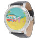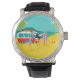 Mit dieser Retro Surfer Couple Watch kann jeder Tag am Strand sein. Das minimalistische Design der 1960er Jahre besticht durch ein unterhaltsames, sonnenbetendes Ambiente, das auf der Suche nach einem Paar ist, das sich auf der Suche nach einer Welle ist. Das Ambiente ist eine tropische Insel-Oase mit einem goldenen Sandstrand, schwebenden, grünen Palmen, einem glitzernden, pfauenblauen Ozean und einem Wasserhimmel. In der Ferne sehen wir eine aquamarine Vulkaninsel, die vorerst ruhend ist. Zurück am Strand, können wir nicht umhin zu bemerken, die süße Fahrt, die unser Paar zu ihrem Traumziel gebracht hat. Es handelt sich um einen modernen, roten und weißen Van mit einem Orange und Gelb Surfbrett, der oben befestigt ist. Obwohl wir nicht sicher sein können, kann man davon ausgehen, dass das Innere des Van mit groovem Teppichboden und dem Geruch nach Weihrauch ausgestattet ist! Surfer Typ und Beach Babe haben passende sonnengeblasene Tans, sonnengebleichtes Haar und blaue, tiki gemusterte Badeanzüge. Surfer Typ hält ein blaues Surfbrett. Beach Babe ist neben ihrem zweifarbigen, rosa Surfbrett stehend. In der Nähe befindet sich ein roter und weißer Beachball, der zur Erfüllung seines Sommerziels gewartet ist. Fang ein paar Wellen und teile Liebe mit diesem kitschigen Sommerdesign!