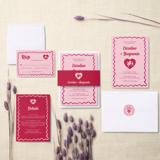 A hand-drawn, bold, and funky wedding details cards that blends vintage charm with modern flair. The design features a playful red background framed by a wavy red outline, giving it a lively, retro vibe. The typography is fun, funky, and modern, with a nostalgic twist that makes the text pop in soft pink. At the center, a heart motif with a cupid inside adds a whimsical, romantic touch, perfectly balancing elegance with cheeky charm. The overall look is funky yet sophisticated, with a hand-drawn aesthetic that feels both stylish and heartfelt—ideal for couples who want their wedding stationery to radiate personality, joy, and retro-modern love.