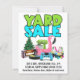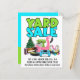 Bright blue and green retro yard sale Postcard with Flamingo Pool float