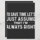 Zeit retten lasse, anzunehmen, dass er immer recht hat, einige Zeit retten, lasse einfach anzunehmen, im immer recht, Spaß Witz, Sarkasmus, zukünftiger Bankmanager, pensionierter Bankmanager, Bankmanager, in der Liebe Wirtschaftslehre, Absolvent, Inspiration für Zuhause Bank Manager ist ein Zuhause-Polizeibeamter, im an, um zu rett Zeit, anzunehmen, im nie falsch, einfach annehmen, retten Zeit, nur nach einer Zeit, nur nach einer Zeit, nach einer Zeit ,