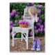 Vergnügen Sie sich mit lila Schuhen mit Hut und Stuhl im Sommergarten.