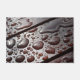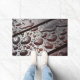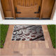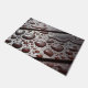 Eine coole Bodenmatte mit einem Foto von riesigen Regentropfen auf einem Holztisch.