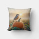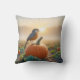 Ein kleiner Vogel sitzt auf einem großen Kürbissingen, während aus seinem Schnabel ein kleiner Kürbiskugel vor einem Sonnenaufgang auf einem unangenehmen Kürbisfeld auftaucht
