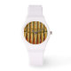 Orgelpfeifen mit orangefarbenem Untergrund; die Nummern auf dem Zifferblatt befinden sich im Schriftart Curlz