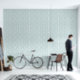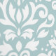 Scroll- und Blattdekorative Damast-Oberflächenmuster in weißem Detail auf einem hellen aquamarinen Hintergrund.