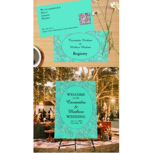 Türkisblaue Wedding Produkte sind mit eleganten, 3D-ähnlichen Gängen und einem lichtdurchlässigen Hintergrund ausgestattet, um Ihre bevorzugte Farbe zu zeigen. Der mittlere Bereich zeigt einen soliden Kreis mit den Namen des Paares und ihrem Hochzeitsdatum auf der Vorderseite. Die Rückseite hat nur das Design. Passen Sie die Farbe des Hintergrunds an, wenn Sie ihn bearbeiten.