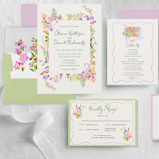 Romantic garden floral wedding invitation with lovely watercolor flowers, In beautiful pastel pinks, lavender and blues. Easy to personalize with lovely script typography.