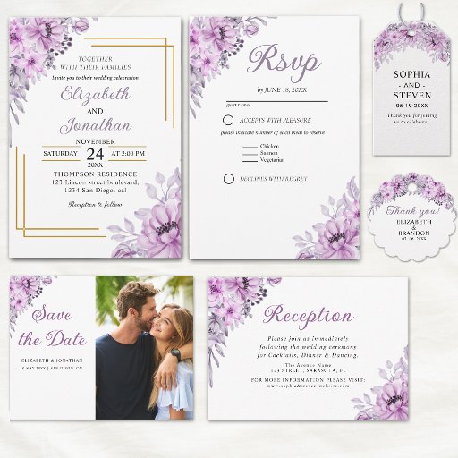 Add a touch of timeless romance to your special day with this elegant wedding set featuring purple watercolor flowers and modern typography. This beautiful purple floral wedding design perfectly complements an elegant and sophisticated look. Ideal for a purple-themed wedding, this collection includes everything you need: from the main invitation to save-the-date cards, reception favors, thank-you notes, and much more. Whether you're planning a spring, summer, or fall wedding, this coordinated set will add an elegant and cohesive touch to your bridal stationery.