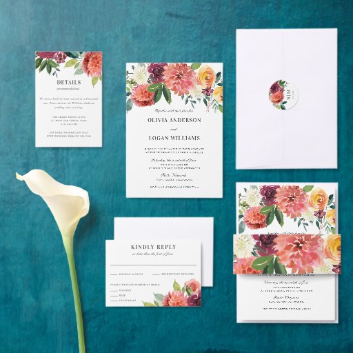 This wedding enclosure card features a beautiful watercolor dahlia bouquet background paired with elegant typography. Together these elements create an rustic yet elegant wedding reply card that would be perfect for a romantic wedding any time of the year. See the collection for more pieces from this wedding invitation suite...