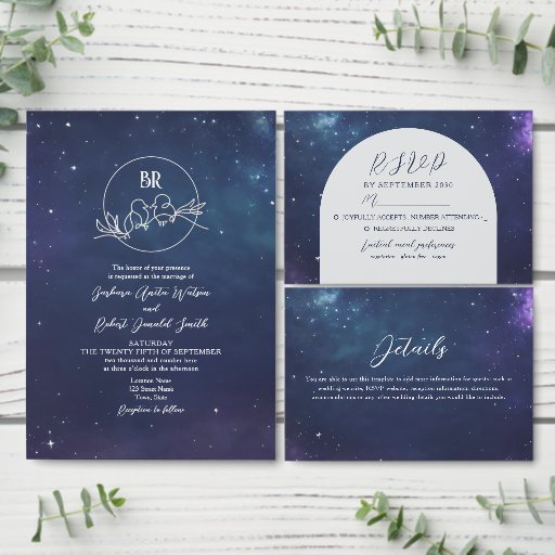 Herbst in Liebe unter tausend Sternen mit dieser romantischen himmlischen Einladung. Ein traumhafter Nachthimmel in den Schattierungen von Sets der Marine und der Violette, während ein zartes Monogramm von zwei von botanischen Ästen umgebenen Lovebirds eine herzliche, persönliche Touch verleiht. Ideal für Paare, die von einer Hochzeit voller Magie, Staunen und einer Liebe, die in den Sternen geschrieben ist, träumen. Personalisieren Sie einfach Ihre Initialen und Hochzeitsdetails für eine wirklich unvergessliche Einladung.