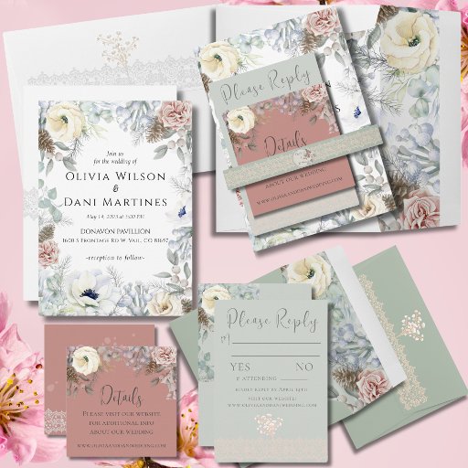 Weiß, Silber, Elfenbein, Rosa Blush Blue Florals mit Elementen der Natur Hochzeit Einladung. Schöne, elegante und romantische, weiche Pastelltöne mit Touchs von Kiefernästen, Beeren und Kiefernbäumen.