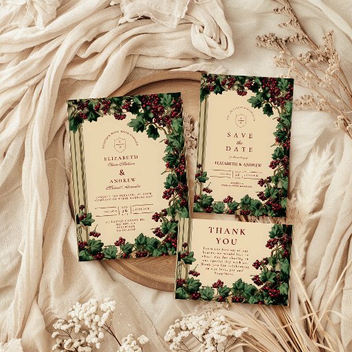 Mit diesem romantischen Efeu und dem beerigen Hochzeitsdesign verleihen Sie Ihrem großen Tag zeitlose Eleganz. Tief grüne Efeu-Blätter und Haufen von reichen roten Beeren bilden einen Vintagen botanischen Stil, der sowohl klassisch als auch bezaubernd wirkt. Dieses Design ist ideal für Paare, die eine traditionelle, rustikale oder Winterhochzeit planen. Es verbindet alten Charme mit natürlicher Schönheit. Personalisieren Sie mit Ihren Namen, Datum und Veranstaltungsort für einen atemberaubenden Sake, der den Ton für Ihre unvergessliche Feier Set.