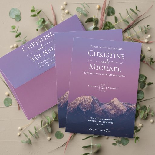 Romantische lila Sonnenuntergang verschneiten Berge Hochzeit. Romantisches Hochzeitsdesign mit Landschaftsfoto von schneebedeckten Felsgebirgen. Die Berge sind von dem sanften orangefarbenen Glühen der untergehenden Sonne kaum berührt. Der Himmel über der majestätischen Bergkette ist in atemberaubenden Naturtönen von Rosa und lila. Ein helles und sehr starkes Farbengefälle, das sich langsam von lila zu tief indigo und blau dreht. Alle Informationen zum Produkt können durch Klicken auf "Diese Vorlage personalisieren" vollständig angepasst werden. Wenn Sie gewollt haben, die Größe des Schriftartes zu ändern oder einige Dinge zu verschieben, können Sie dies erreichen, indem Sie auf "Bearbeiten mit dem Designwerkzeug" klicken. Sie können mich immer bezüglich des Designs kontaktieren, indem Sie unten auf "Nachricht" klicken.