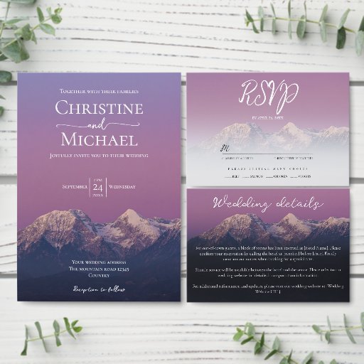 Romantische lila Sonnenuntergang verschneiten Berge Hochzeit. Romantisches Hochzeitsdesign mit Landschaftsfoto von schneebedeckten Felsgebirgen. Die Berge sind von dem sanften orangefarbenen Glühen der untergehenden Sonne kaum berührt. Der Himmel über der majestätischen Bergkette ist in atemberaubenden Naturtönen von Rosa und lila. Ein helles und sehr starkes Farbengefälle, das sich langsam von lila zu tief indigo und blau dreht. Alle Informationen zum Produkt können durch Klicken auf "Diese Vorlage personalisieren" vollständig angepasst werden. Wenn Sie gewollt haben, die Größe des Schriftartes zu ändern oder einige Dinge zu verschieben, können Sie dies erreichen, indem Sie auf "Bearbeiten mit dem Designwerkzeug" klicken. Sie können mich immer bezüglich des Designs kontaktieren, indem Sie unten auf "Nachricht" klicken.