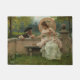Dieses Design zeigt ein Gemälde des italienischen Künstlers Federico Andreotti (1847-1930). Es zeigt eine elegante junge Frau, die auf einer Steinbank in einem Parkland sitzt. Sie spricht mit ihrem männlichen Koffer, der neben ihr herumkauert. Die beiden Liebhaber haben ein romantisches Gespräch abseits der neugierigen Augen von Familie und Freunden. Die Dame trägt ein modisches weißes Kleid und hält einen Sonnenschirm, um sich vor der Sonne zu schützen. Der Herr trägt auch ein historisches Kostüm, das der Zeit angemessen ist. Auf der Bank neben der jungen Frau befindet sich ein Buch, das vielleicht die Liebe enthält, und einige rosa Rosen, die vielleicht von ihrem Bewunderer gegeben worden sind. Das Paar ist von schönen grünen Bäumen umgeben. Ein See oder ein Fluss fließen durch den Park.