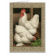 Ein rustikaler Kunstdruck mit einem kräftigen Hahn und einer Henne in einem Hühnerhaus. Der darc ecru Rahmen besteht aus spiralförmigen Elementen. Dieser Druck wäre eine große Ergänzung zu einer ländlichen Zuhause-Dekoration.