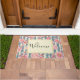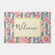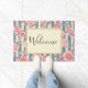 Eine willkommene Türmatte mit einem wunderschönen Muster aus hübschen rosa Blume, die auf einem gestreiften Muster aus blauen und cremefarbenen Streifen liegen.