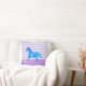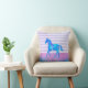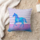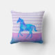 Ein Kissen mit einem hübschen Aquarellpferd in Blau und lila Farben. Laufen wild und frei. Set auf lila gestreiftem Hintergrund mit Vintagem Flair. Ein blau-rosa Wasserfarbenrand lag am Boden.