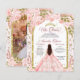 Eleganter goldener Bogen mit blumengeschmücktem Prinzessenkleid für die 15. Geburtstags-Quinceanera-Einladung.