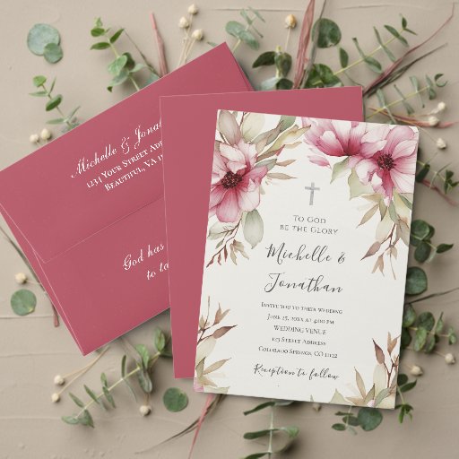 Die christliche Hochzeitseinladung zeigt die eleganten Frühlings- und Sommergarten mit den blühenden Wasserfarben mit den schönen, rosafarbenen Blume und Grünpflanzen. Es enthält ein kreuzes und inspirierendes Zitat: "Für Gott sei der Ruhm." Wenn Sie etwas nicht sehen oder Änderungen wünschen, kontaktieren Sie mich bitte mit dem Chat-Button auf der Zazzle-Seite.