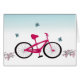 Ein niedliches Design mit rosa Fahrrad mit rosafarbenem Sitz und Rahmen, schwarzen Pedalen und schwarzen Reifen. Ein weicher, blauer Hintergrund mit kleinen blauen Schmetterlingen, die umherfliegen.