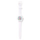 Eine Uhr eine niedliche Illustration eines rosa Flamingos mit Wassermelonen und Ananas. Rosa und grüne Farbe. Summerisch und tropisch. Der Hintergrund ist eine hellgrüne Farbe mit weißen Polka-Punkten. Das Uhrengesicht ist ein Art Deko Schriftart.