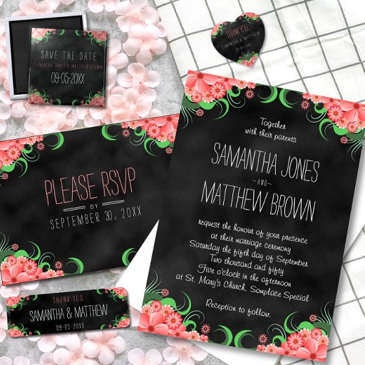 Pink Floral Hibiscus Black Chalkboard Wedding SetDesignt von Marina
