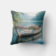 Ein hölzernes Ruderboot mit lebhaften rosa Blume treibt friedlich auf einem ruhigen See, umgeben von üppiger Vegetation und abgelegenen Bergen
