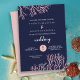 Ein elegantes Set mit einer Hochzeitsfeier am Strand mit schimmernden, rosafarbenen Korallen auf einem dunkelblauen Hintergrund mit modernster Kalligrafie. Senden Sie mir eine Nachricht, wenn Sie das Design in einem anderen Farbschema mögen. Original Design & Illustrationen von Kitty Pie Prints.