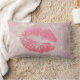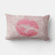 Kissen aus Lumbar mit einem Hintergrund, der mit einer modernen trendigen Rose aus goldenen tropischen Blätter kombiniert wurde. Oben platziert sind pinkfarbene glitzernde Lippen.
