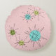 Dieses Muster des rosa Iconic AtomSternexplosion-runde Kissens (großer Druck) kennzeichnet iconic AtomSternexplosionen. Das ist recht! Die alte Schule, First Lady, den Rosa Hintergrund mit Goldtupfen färbte, ist- der perfekte Hintergrund für den vibrierenden Türkis, den beruhigenden Sellerie und farbigen die Kreise des kitschy Birnengrüns. Die Stellen der Farbe werden sporadisch in verschiedene Größen mit der Bedeckung der schwarzen v-förmigen Linien, um die Mod Sputnik-Sternexplosionen zu bilden gelegt. Angeredet nach richten Fünfzigerjahre Muster, dieser retro inspirierte Entwurf hat alles an, das Sie die moderne Mitte des Jahrhunderts wirklich sein müssen.