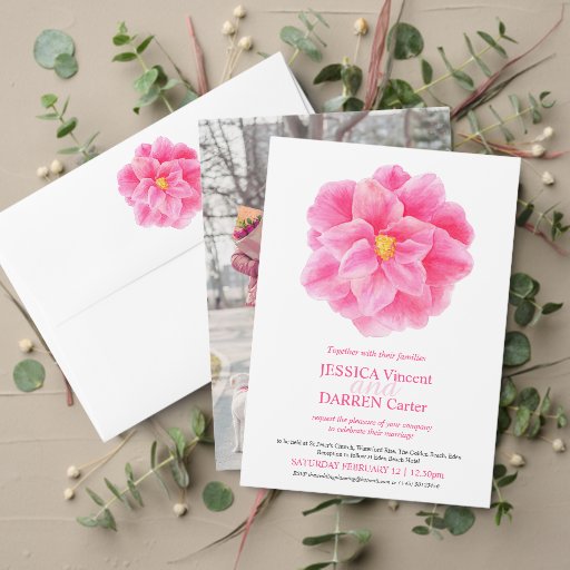 Schöne Aquarellfarbe rosa Hochzeitsaufkleber in rosa Farben. Personalisieren Sie mit dem Namen Ihrer Braut und Bräutigam und dem Hochzeitstag. Teil der rosa Kamelien Aquarell Blume Hochzeit feststehendes Set. Entworfen von Sarah Trett. www.sarahtrett.com für www.mylittleedenweddings.com