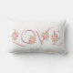 Rosa Liebe Typografie Rose Valentinstag Lumbalkissen. Dieses elegante Design besticht durch das Wort "LIEBE" in einem dekorativen Relief-Schriftart in rot-rosa mit einem Bouquet aus rosa Rosen.