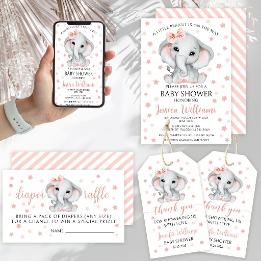 Rosa Mädchen Elefant Baby Dusche Windel Gewinnkart Begleitkarte